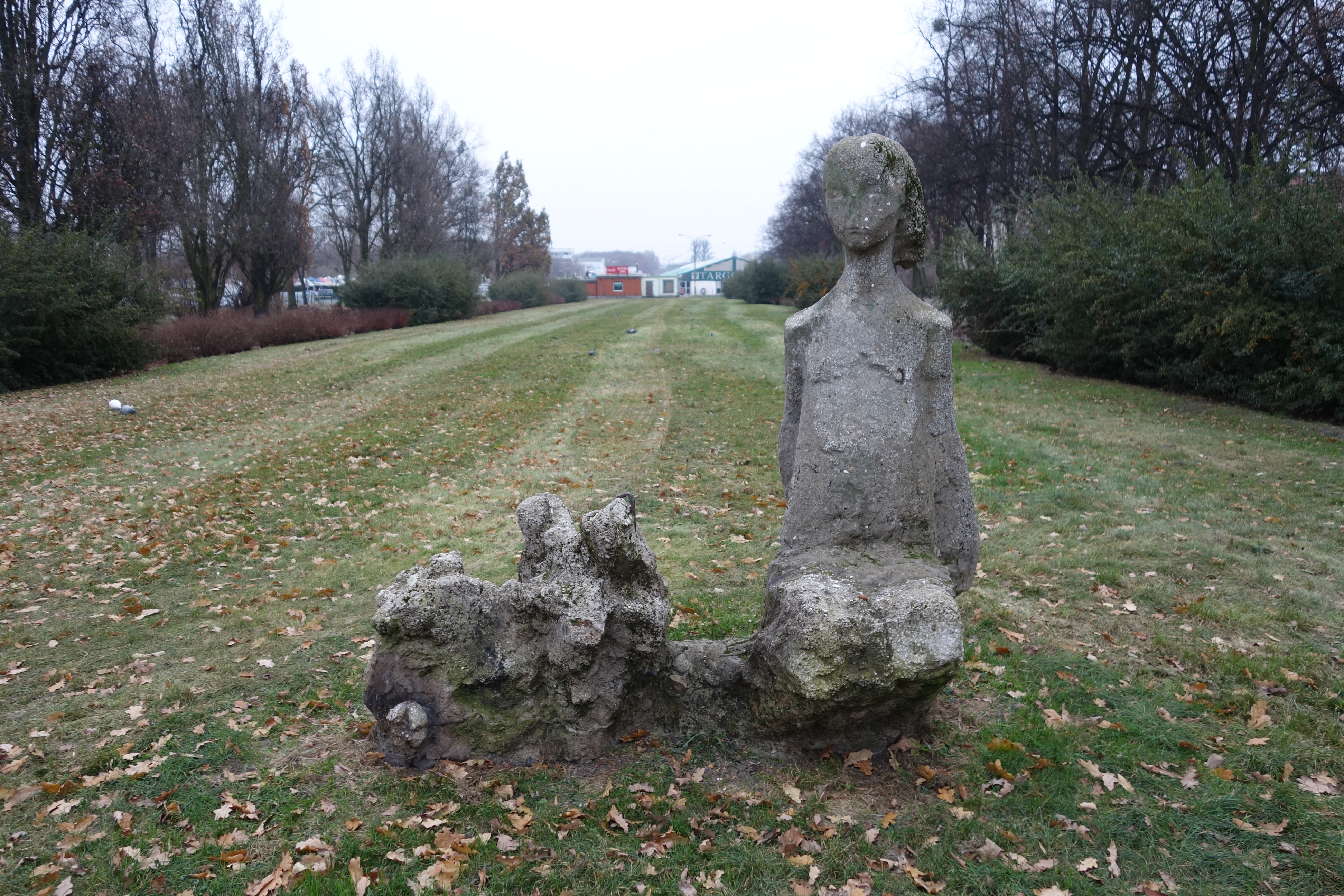 The actual stadium was abandoned in the 1990s when a new one was built for the Warta football team. Warta is Poznan’s smaller club, rival to Lech, who got a big new stadium for the European football championship Euro 2012. Małgosia conducted ethnographic research in which Warta fans turned out to be the only ones who know the function the stadium served during the war. Essentially, it was a work camp where Jews were briefly held before being shipped off to the death camps. Many detainees were shot right there on the spot. We walked through the broken down gateway, up a set of stairs to an earthen berm surrounding what used to be the playing field. Today, the site is covered with trash, and trees grow everywhere including where the bench seating used to be. Only the concrete supports of the benches are left. Goal posts stand on the field, left over from 2012 when local teams competed in a kind of lighthearted protest against the massive outlay of funds for Euro 2012.