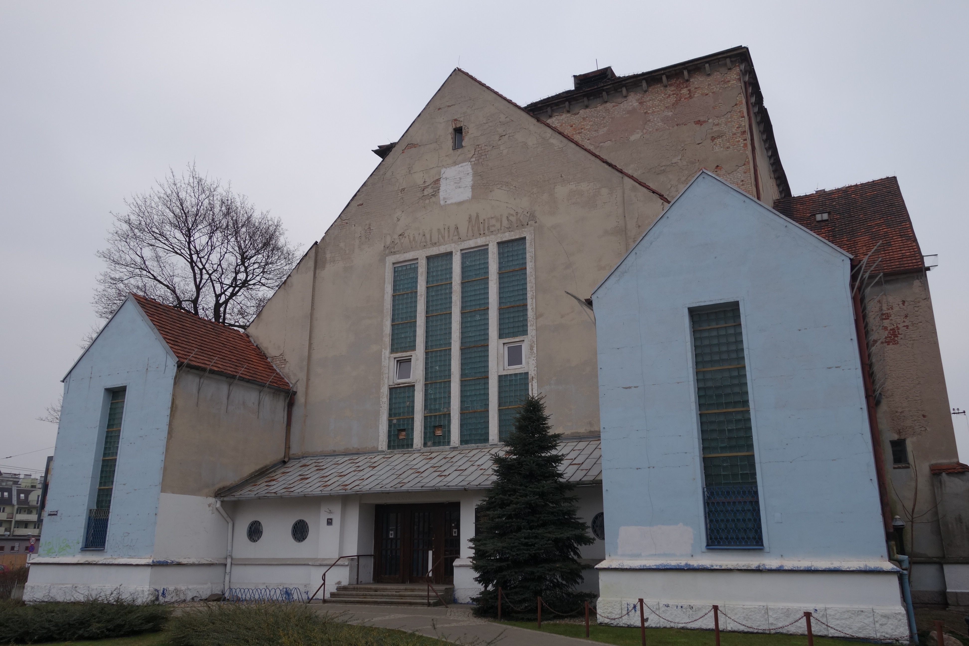 The exterior of the former “new” synagogue in Poznan. The words “Pływalnia Miejska” (City Pool) can be made out above the long central windows. The pool was closed just three years ago in 2011.