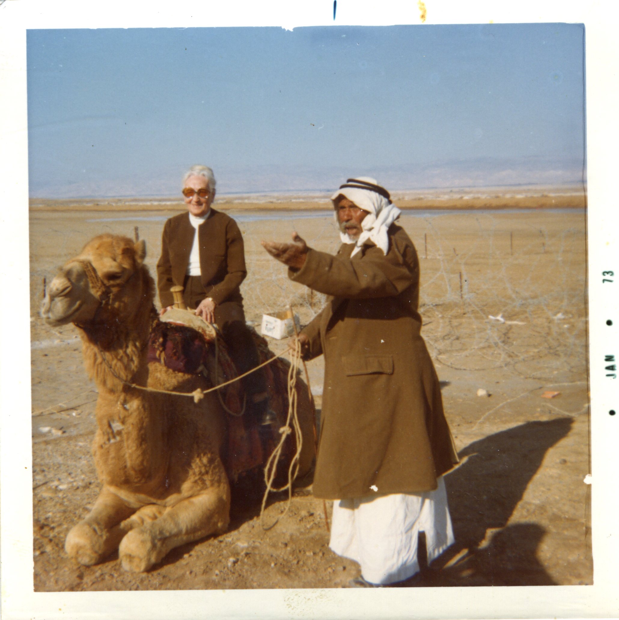 When Nunia was in her mid-80s, she went to Israel. I remember my mom’s wonderment as she described Nunia’s continued vitality. The image that proved it is a photo of Nunia perched upon a camel. The photo is stamped 1973, but cousin Yvonne in Israel remembers showing Nunia around Jerusalem in 1972. Back then, the date in the white edge of photos specified when the prints were made, so maybe Nunia didn’t develop the film right away.