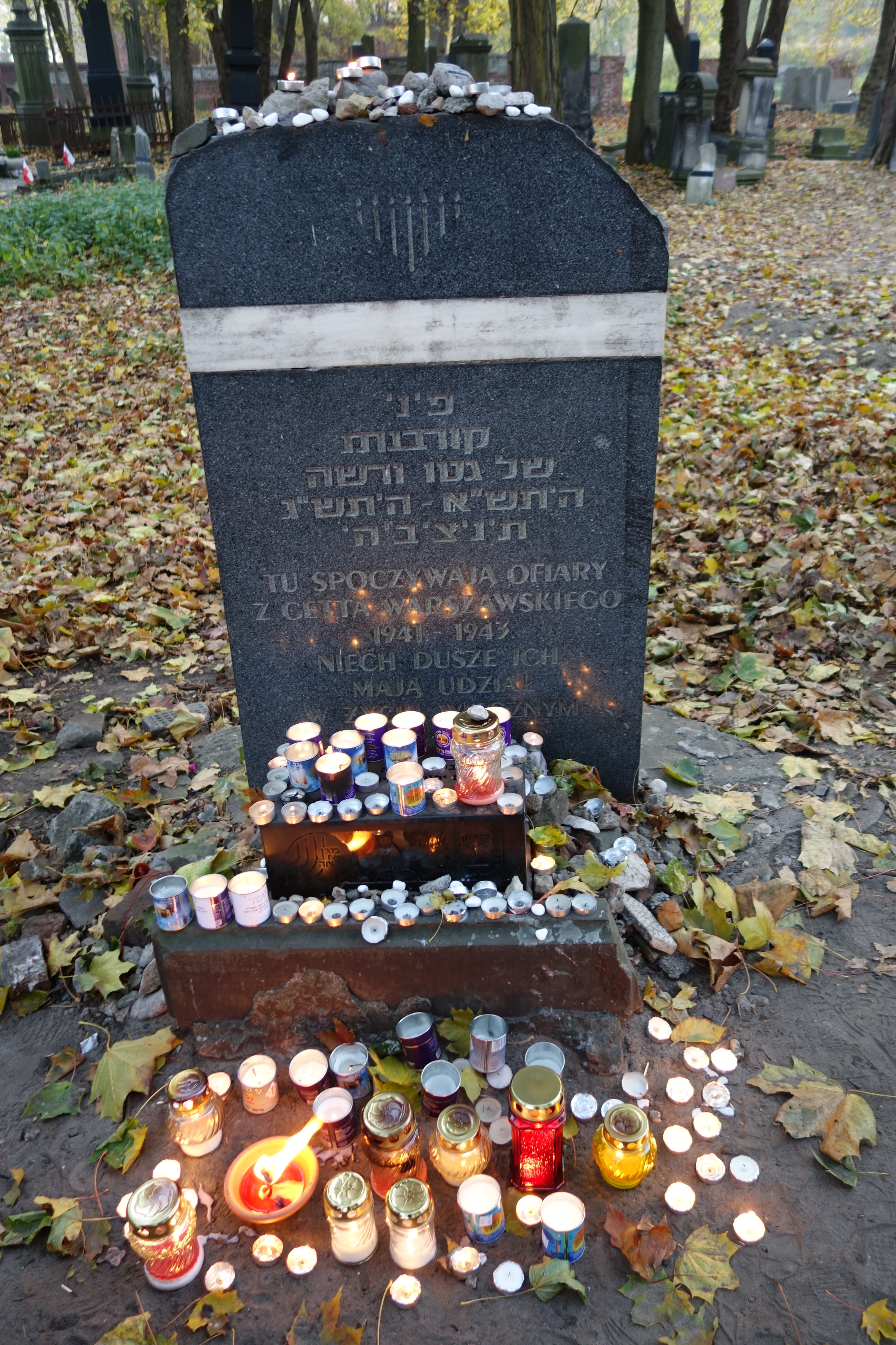 Okopowa: Warsaw’s Jewish Cemetery, All Souls Day 2014 21 Saturday Nov 2015 Original size at 2592 × 3888 ≈ Leave a comment “Here rest the victims of the Warsaw Ghetto 1941-1943” The plaque looks like a tombstone. The top is covered with stones and lighted candles cluster around its base
