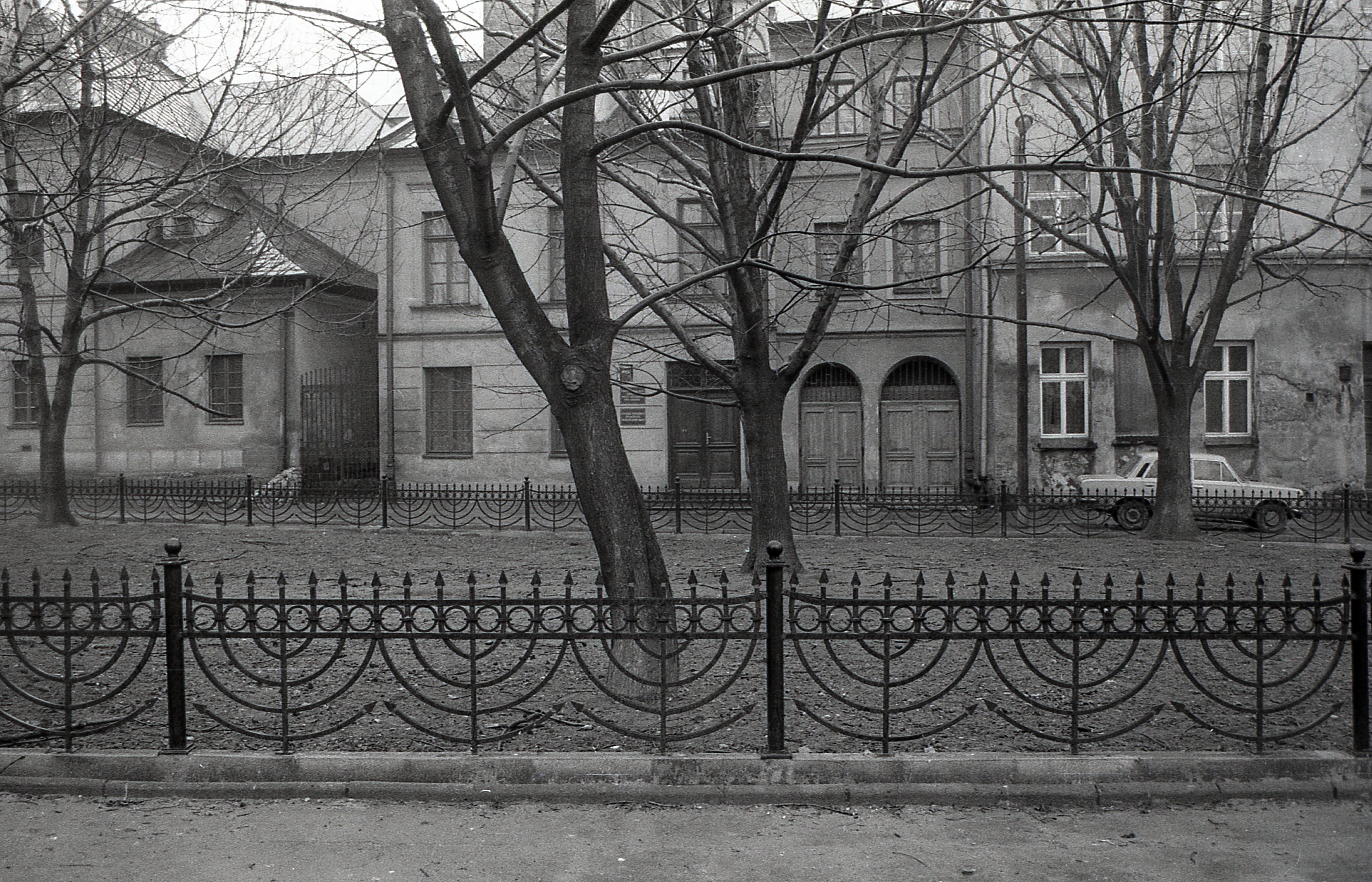 Jewish Krakow 1992 01 Tuesday Mar 2016 Original size at 3319 × 2135 ≈ Leave a comment A menorah motif on the fence around the green space on Szeroka Street, 1992