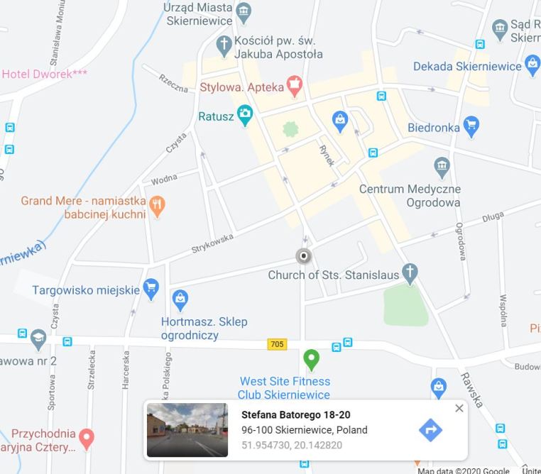 Memory Map Exhibition includes Skierniewice, the Piwkos’ Hometown 08 Friday May 2020 Original size at 961 × 843 ≈ Leave a comment Map of contemporary Skierniewice. The site of the synagogue is marked with a black dot surrounded by a grey circle. source: Google Maps