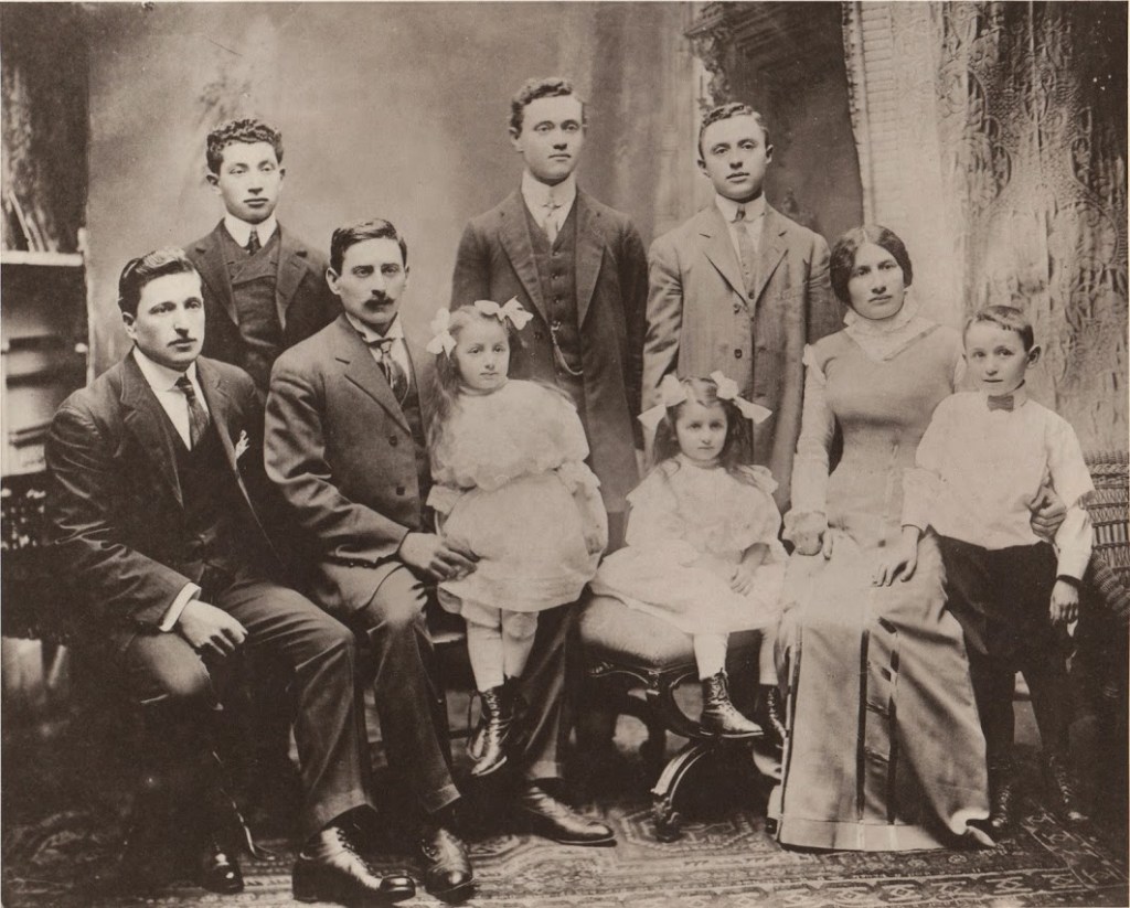 The Pifko brothers around 1908, New York. Front from left: Philip, Abraham, Paulina, Ewa, Bertha, Nathan. Back from left: Raphael Kolski, Sam and Max Alexander