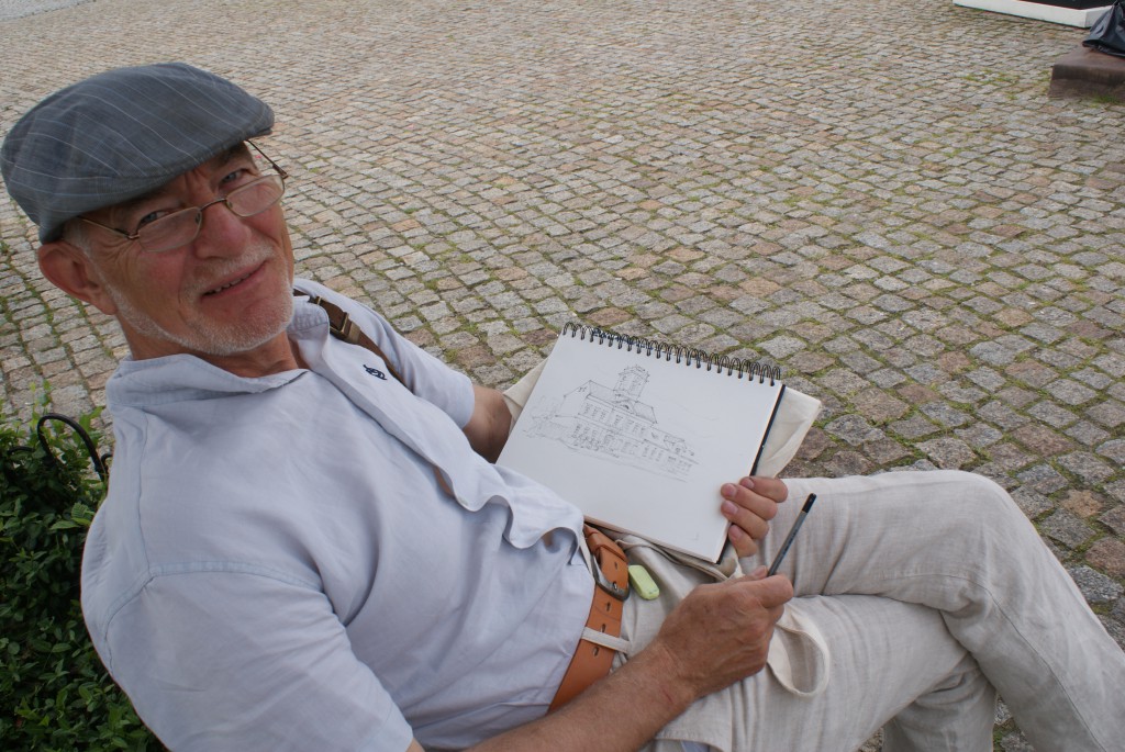 We met Grzegorz Stęplewski on September 9 at the Kutno Community Center so we could talk about what remains from the Jewish community of Dąbrowice. Grzegorz lives in Kutno and is a member of TPŻK (Friends of the Kutno Region), but he grew up in Dąbrowice, a village of about 1,300 residents nearby. Grzegorz likes to paint and sketch; he imagines scenes as they would have looked based on historical records and the current configuration of streets, for example reinserting the synagogue next to his childhood home.