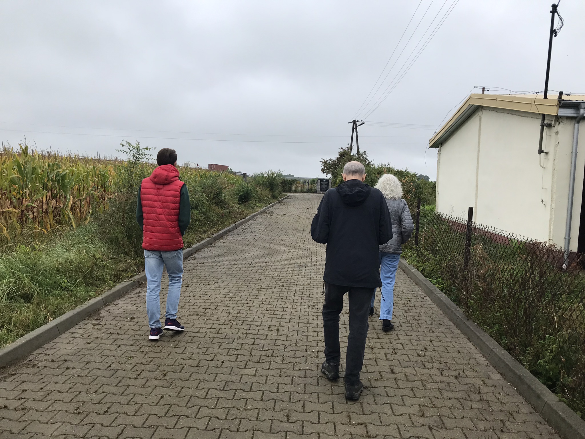 We continued on a roundabout route to the site of the cemetery. Gzegorz pointed out where the center of town was visible across agricultural fields, and explained the old, unpaved road takes a more direct route but it’s only suitable for farm vehicles. The cemetery plot stands forlorn, an overgrown thicket surrounded by plowed fields. Getting to it would require walking across those fields. It’s unlikely that any grave markers remain under the shrubs and small trees. Grzegorz said that at minimum, there should be a sign at the side of the road indicating the location of the Jewish cemetery.