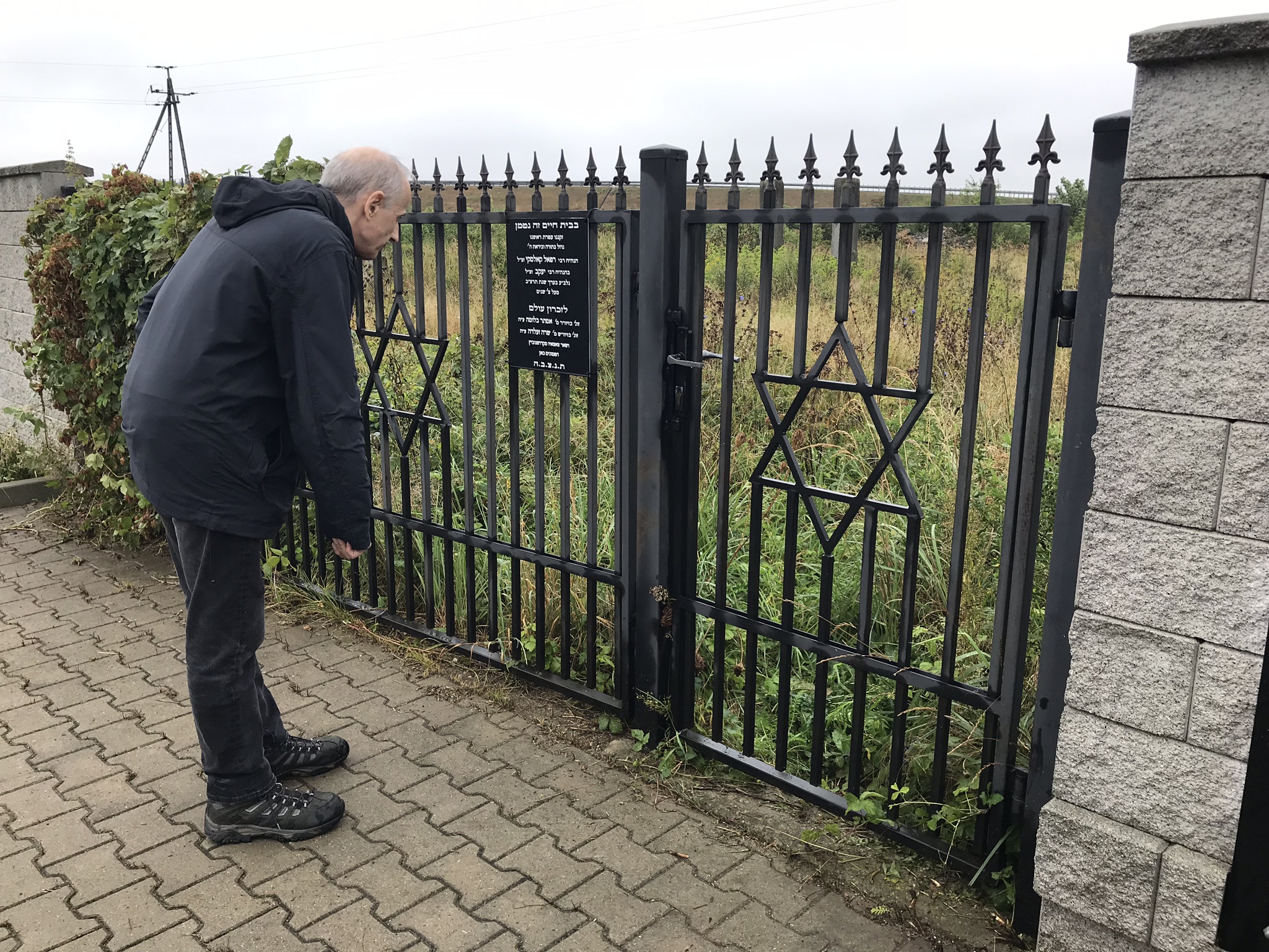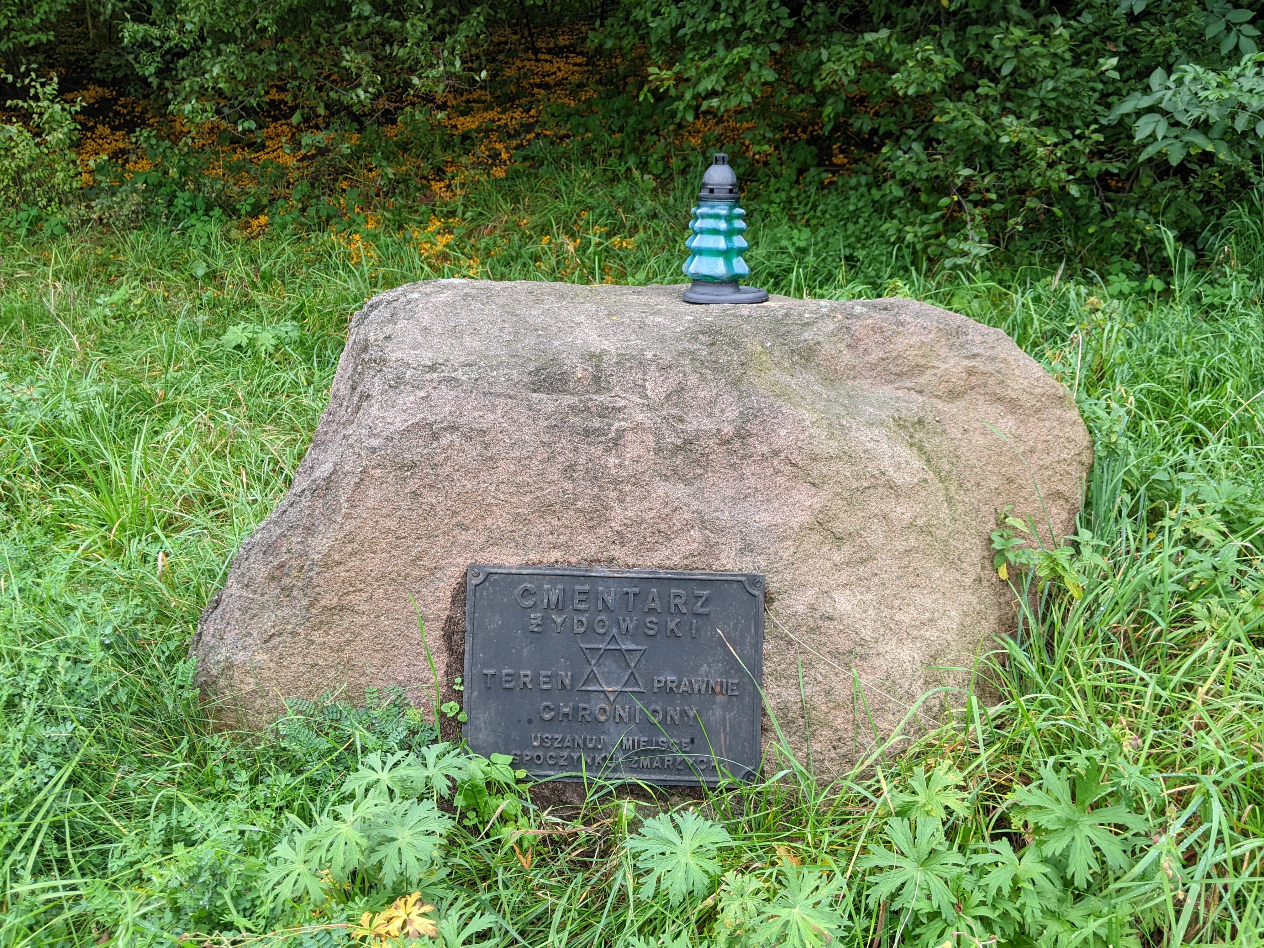 We concluded our visit at the cemetery, which is 900 meters from the center of town. Cars whizzed by on the city bypass running up the slope from the cemetery. A paved drive leads to a metal gate, and a plaque on the right contains a brief history of the city’s Jews in Polish, English, and Hebrew. The Foundation for the Preservation of Jewish Heritage (FODŻ) installed it in 2014.