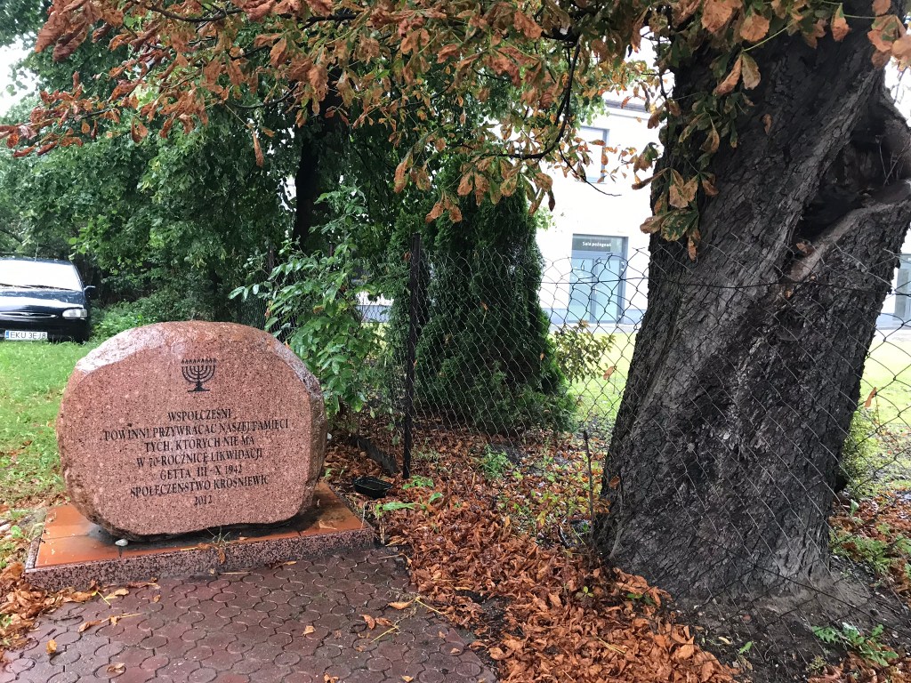 Krośniewice Mayor Katarzyna Erdman, Sławomir Mikołajczyk, and his son Adam Mikołajczyk stood on the side of the main road from Kutno, sheltered from the rain under two umbrellas. Sławomir, a member of the Krośniewice branch of the Friends of Kutno (TPŻK), works at the city museum, while Adam a City Hall employee, shares his father’s passion for local history. They waited for Roberta, Yosef, and me in the rain so they could start our tour of Jewish sites at a memorial stone engraved with the statement: