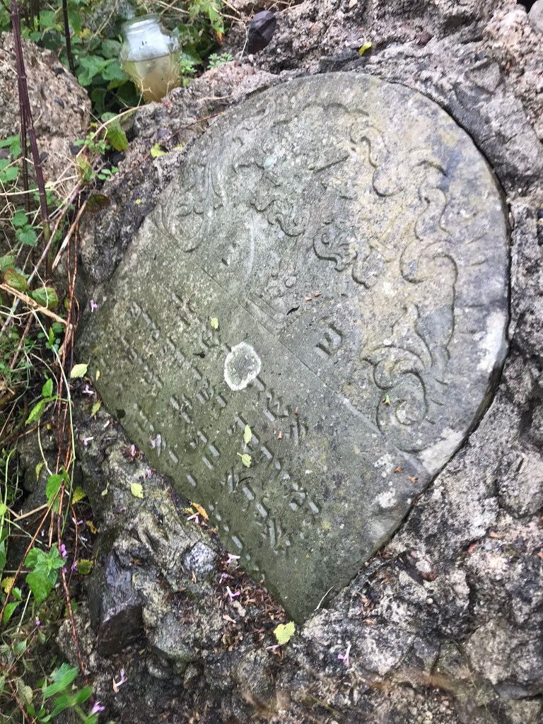 The cemetery is mostly covered by calf-high grass and wildflowers, with small trees toward the back of the plot. Bachna pointed to a building on the other side of the concrete fence along the left-hand border of the cemetery, which she believes was the mortuary house where bodies were prepared for burial. A sign at the edge of the road labels the site “kirchol,” a regional term for a Jewish cemetery, and outlines the history of the town’s Jewish population. Further back, around the place where the land slopes upward, stands a boulder with a plaque saying (in Polish):