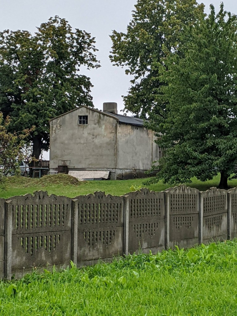 The synagogue was destroyed during the war. Some years later, Grzegorz’s father added the synagogue plot to the back garden of his house. He has what is called a dzierzawa wieczysta, a perpetual lease; in effect, he doesn’t own the land but can use it indefinitely. It currently sits behind a stone wall, though we could see into the yard from the neighbor’s driveway gate. Based on the size of the lot and the space Grzegorz paced out for us, the synagogue was not large.