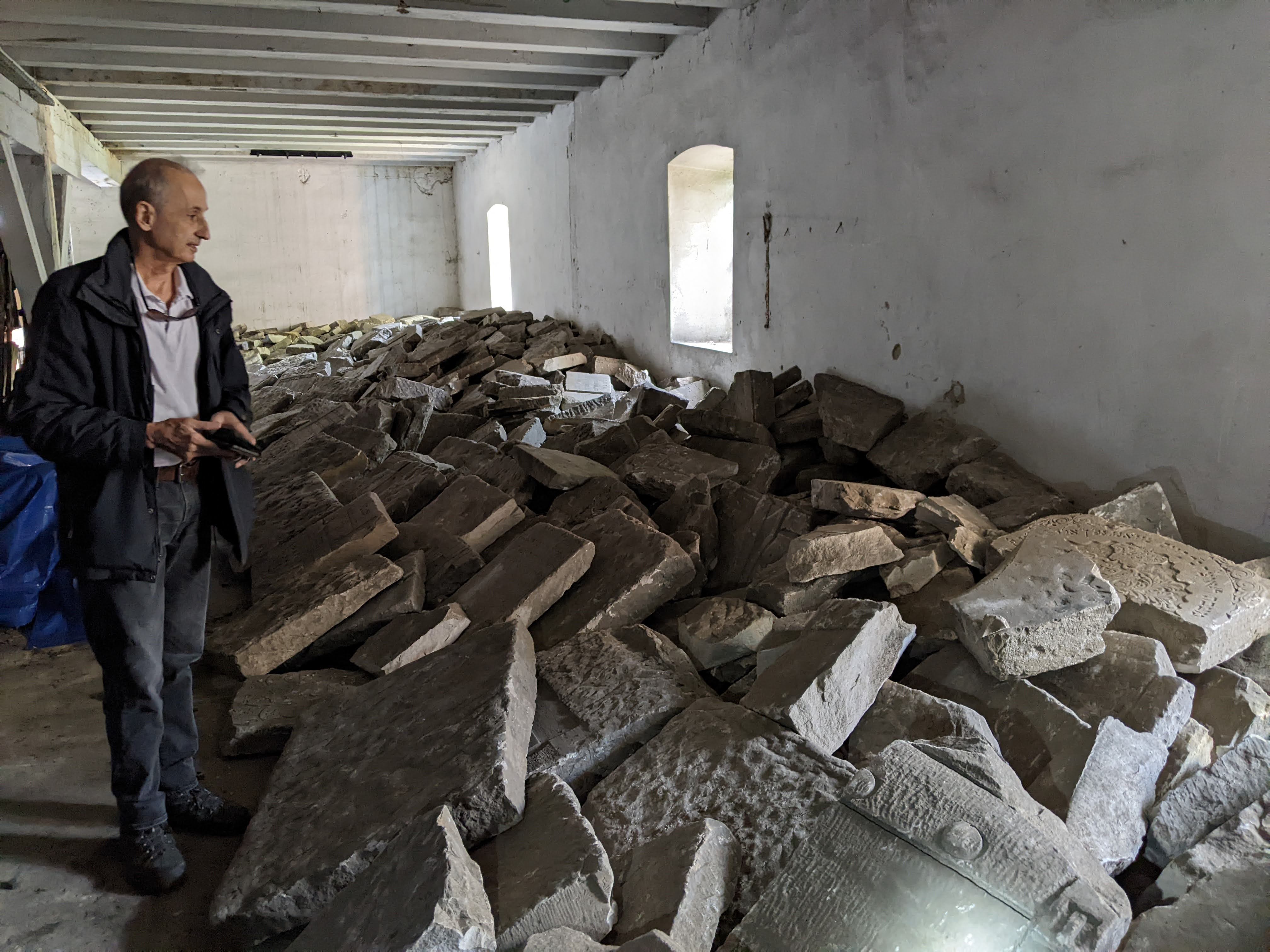 Next, we met the Kutno Regional Museum Director Grzegorz Skrzynecki and others at a defunct brewery warehouse where the museum stores hundreds of matzevot fragments recovered from the places they were used in road and construction projects (a common practice during and after the German occupation). The volume of stones is astounding, though still just a fraction of the matzevot plundered from the cemetery. You can see many of them with English translations of the decipherable texts in Yosef Kutner’s book Broken Memories: Remains from the Jewish Cemetery in Kutno. Yosef compiled the book from photographs, so this is the first time he saw the actual stones. Piled as they were, most of their identifying numbers are not visible. Nevertheless, there on the surface, Yosef found the top of his great grandfather’s tombstone. Mr. Skrzynecki explained that more fragments were found during a recent road project. They didn’t make it into the book, but I’m sure Yosef will find a way to share that information once he has it.