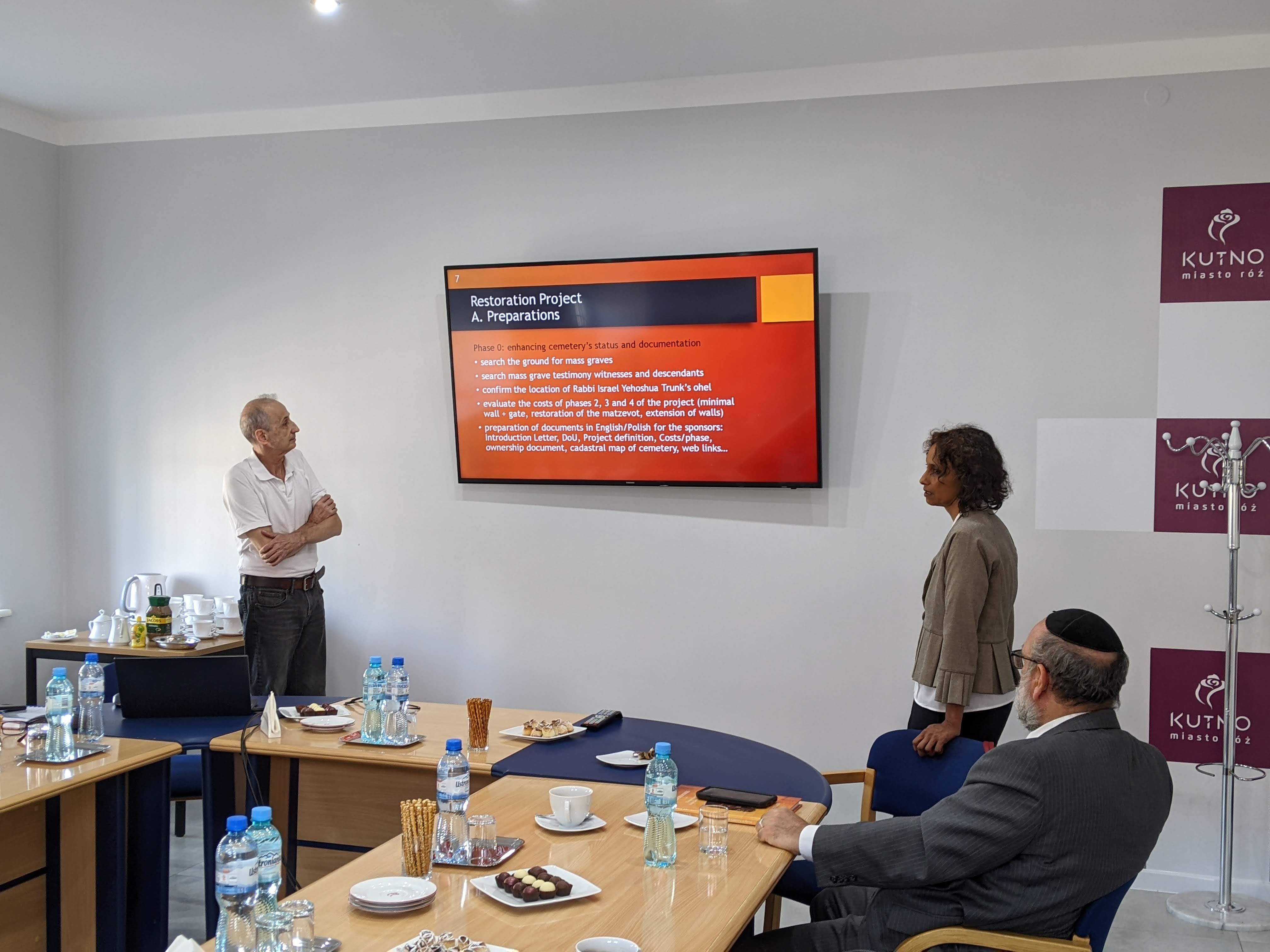 Yosef Kutner presenting his proposal for the Kutno Jewish Cemetery. Rabbi Schudrich seated on the right