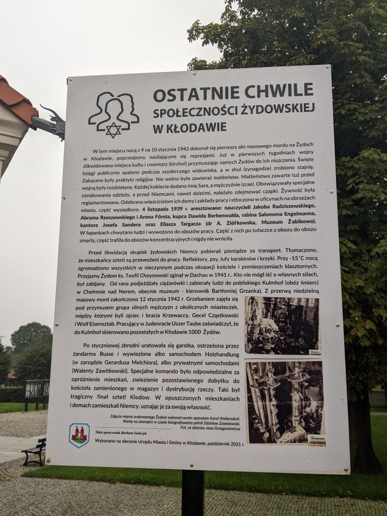 In the center of town, we visited the church where Jews were imprisoned on the night of January 9-10, 1942 a nd then transported to the death camp at Chełmno. An informational sign outlining “the last moments of the the Jewish community in Kłodawa” was mounted here in 2021.