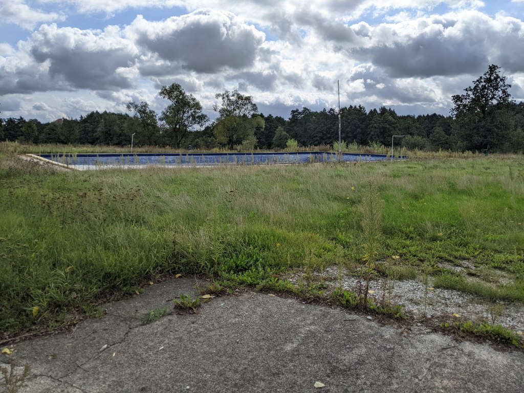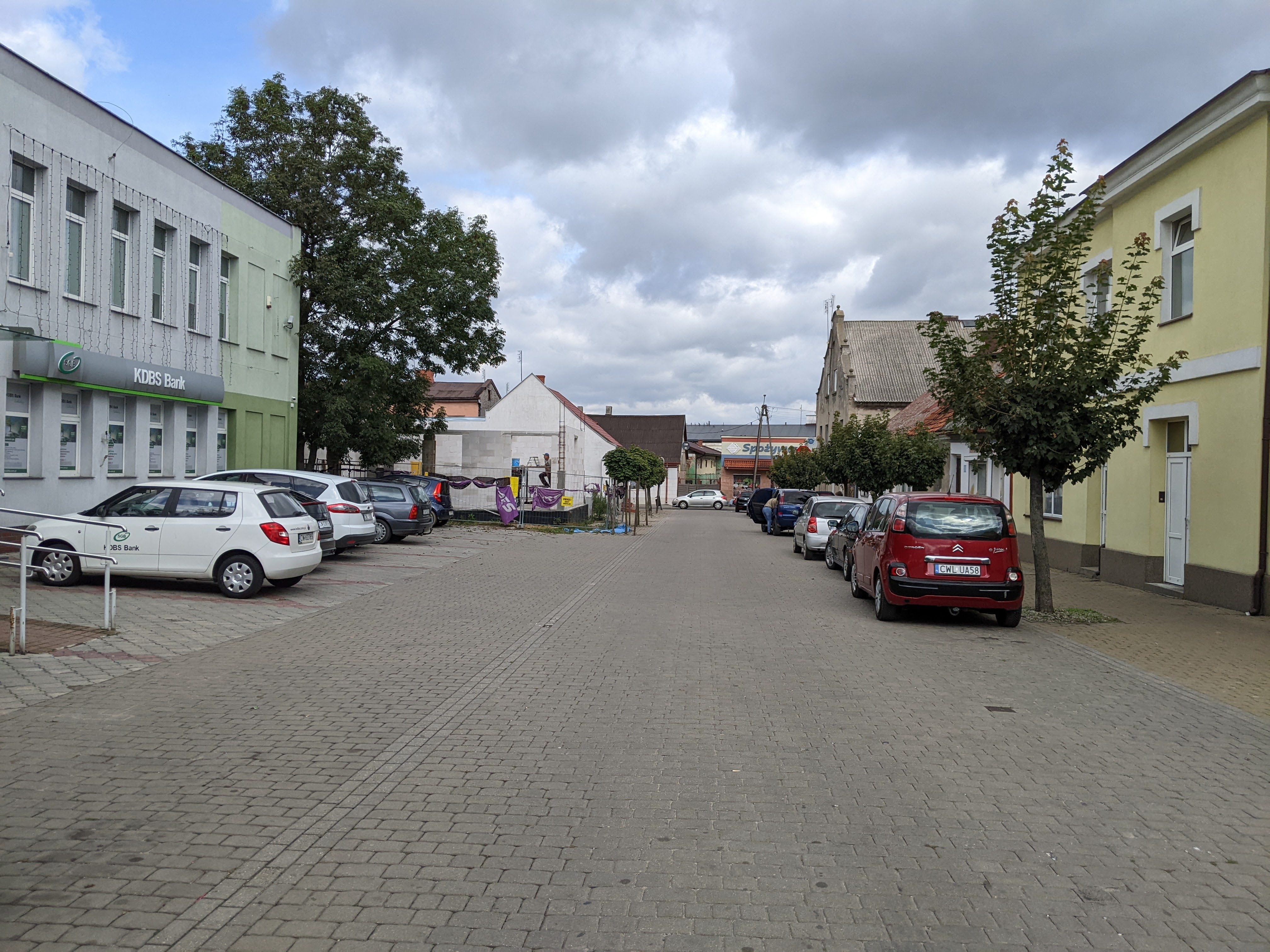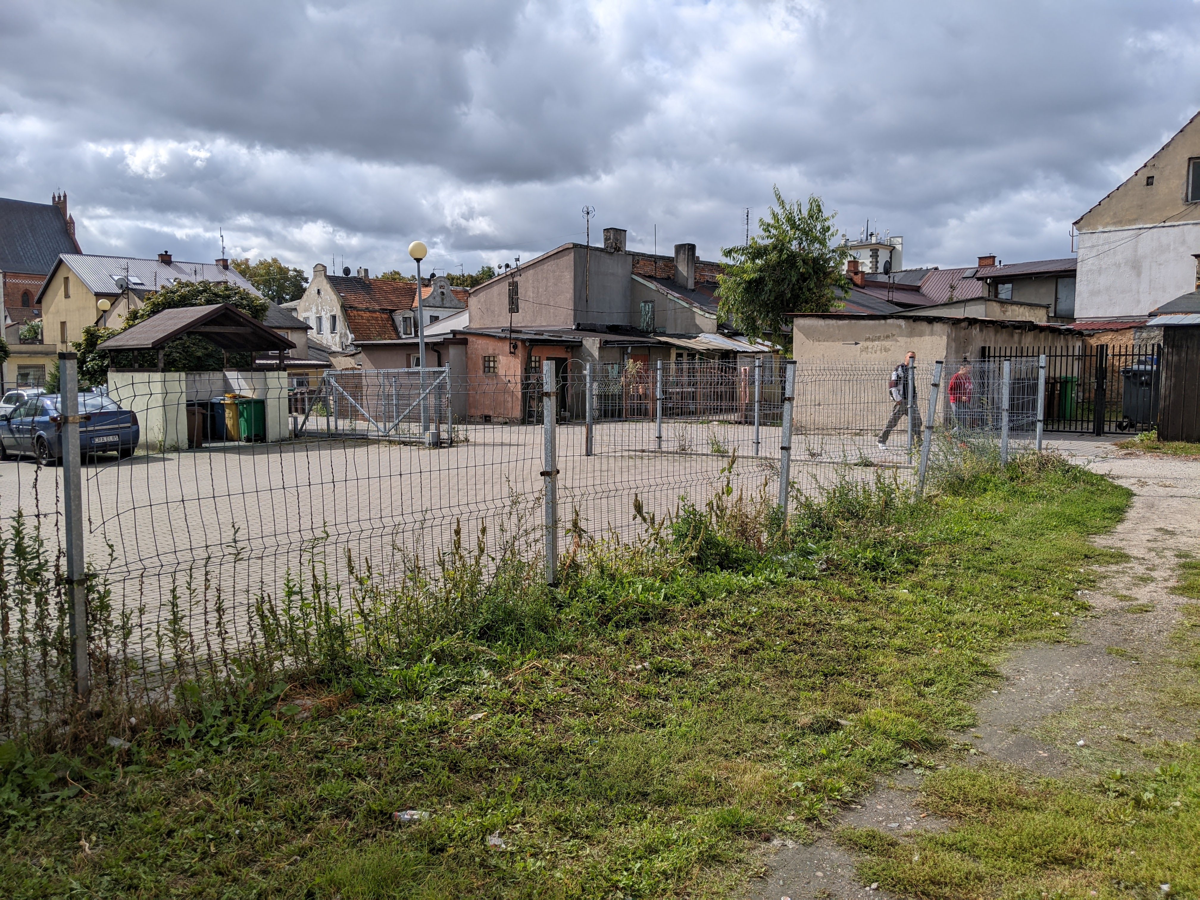 We continued to Lubień Kujawski, to a dirt and gravel parking lot at the site of the Jewish cemetery. During the summer, swimmers park there and walk down a narrow dirt trail to the river.