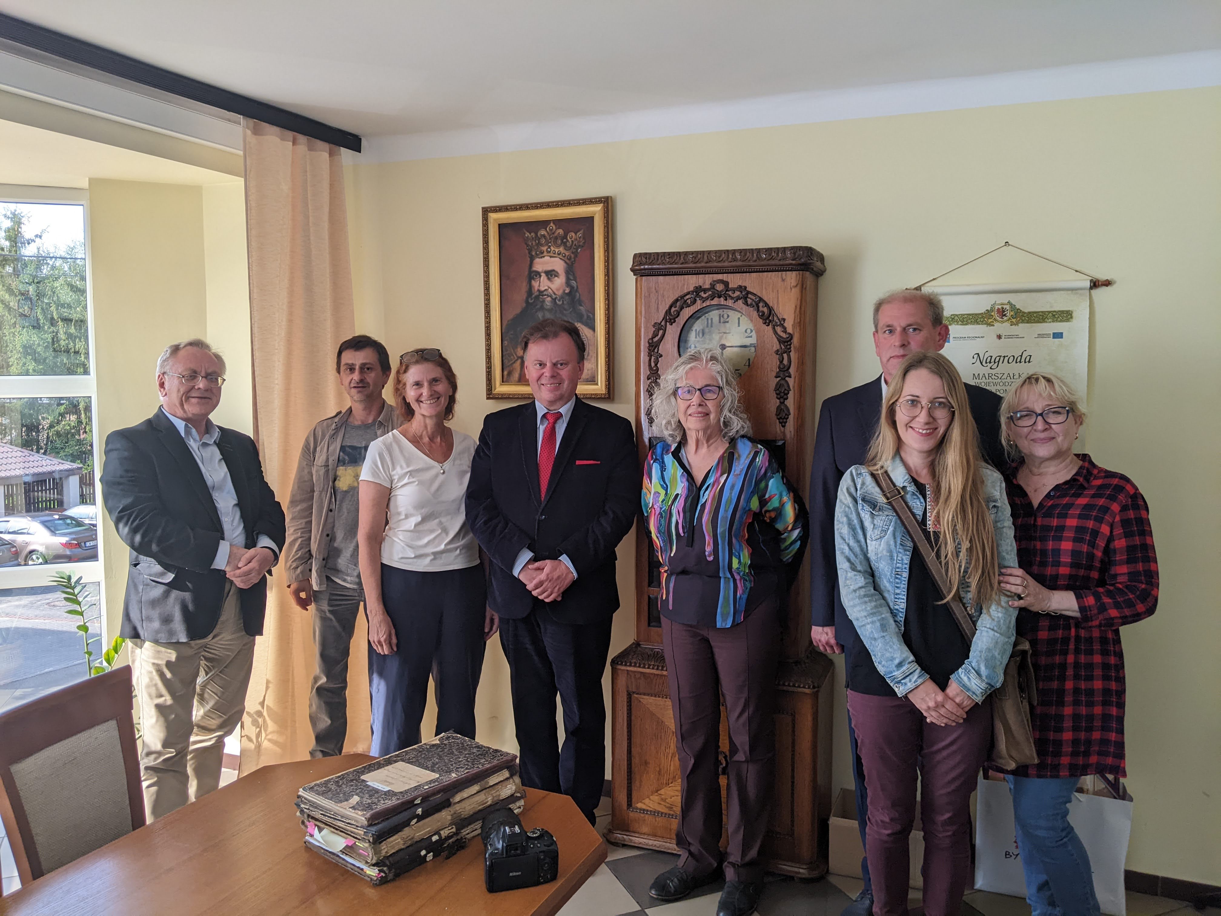 Longin Graczyk, the director of the Ari Ari Foundation, promised to meet us in Kowal at 1 PM for a meeting with the mayor and others involved in Jewish heritage work. From there, he said we could meet some activists in Lubień Kujawski and still make it to Chodecz in time for our scheduled 5 PM meeting with heritage association members there. Roberta and I were understandably skeptical everything could be accomplished within such a narrow timeframe. But true to his word, Longin shepherded us through the afternoon and made sure that we did everything as planned. Longin and Justyna Marcinkowska, another activist with the Ari Ari Foundation, met us outside city hall and accompanied us up to the second-floor office of Mayor Eugeniusz Gołembiewski. The room overflowed with people eager to share their knowledge of local history.