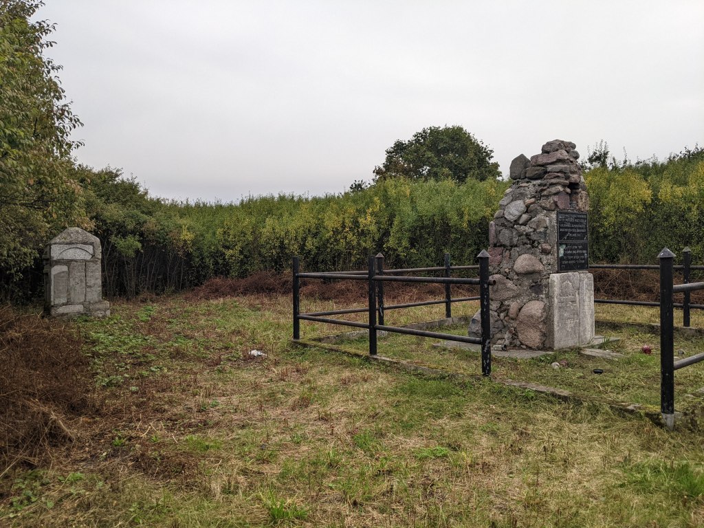 The rest of the cemetery ground is overgrown with 9-foot blackthorn shrubs that make an impenetrable thicket. The sharp thorns on this plant pose a particular problem for cemetery maintenance. Bożena told me that it took a crew of four to clear a narrow pathway through the overgrowth to the memorial monument and a fourth concrete-and-matzevah obelisk. I had to watch my step to avoid the stumps of the blackthorn bushes that were cut six inches from the surface of the ground. I didn’t see signs that the bushes were growing back, but I have been warned that they will unless everything is trimmed back again before next spring.