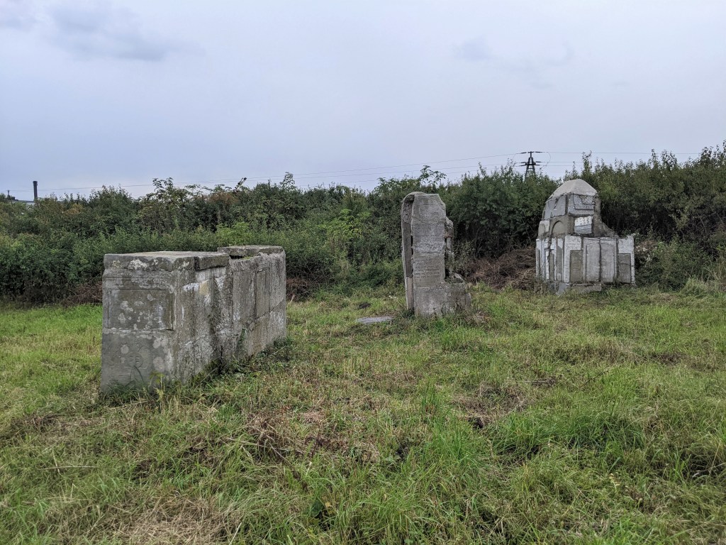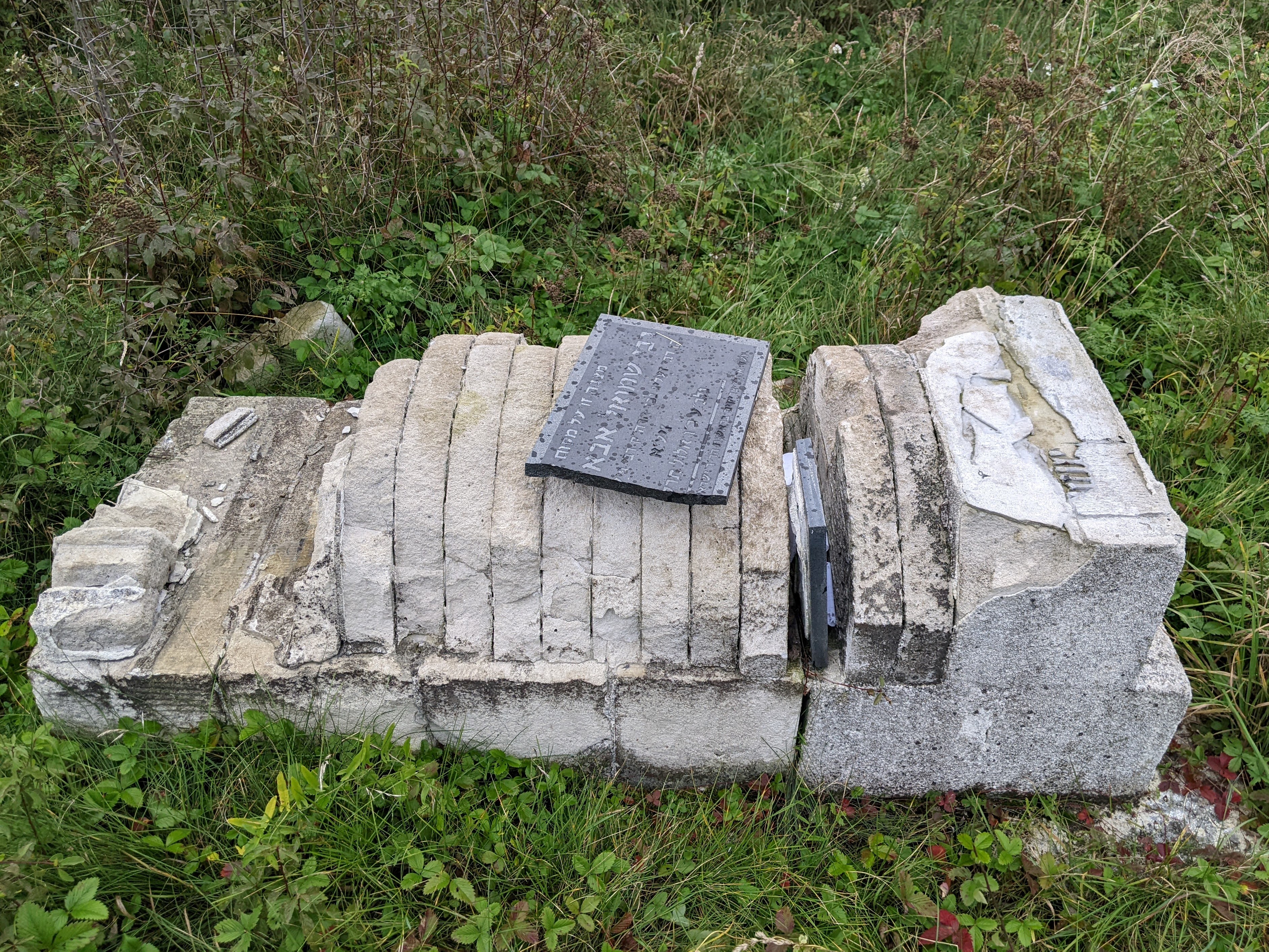 The cemetery gate needs repainting, though it remains sold. A padlock hangs from the latch but the gate is unlocked. The area that was cleared around the monuments remains accessible. I took a closer look at the three irregular monuments made from matzevot fragments held together with concrete. Some of the tombstones have come loose and lie on the ground. Others appear to be missing. Red graffiti scars the front of one.