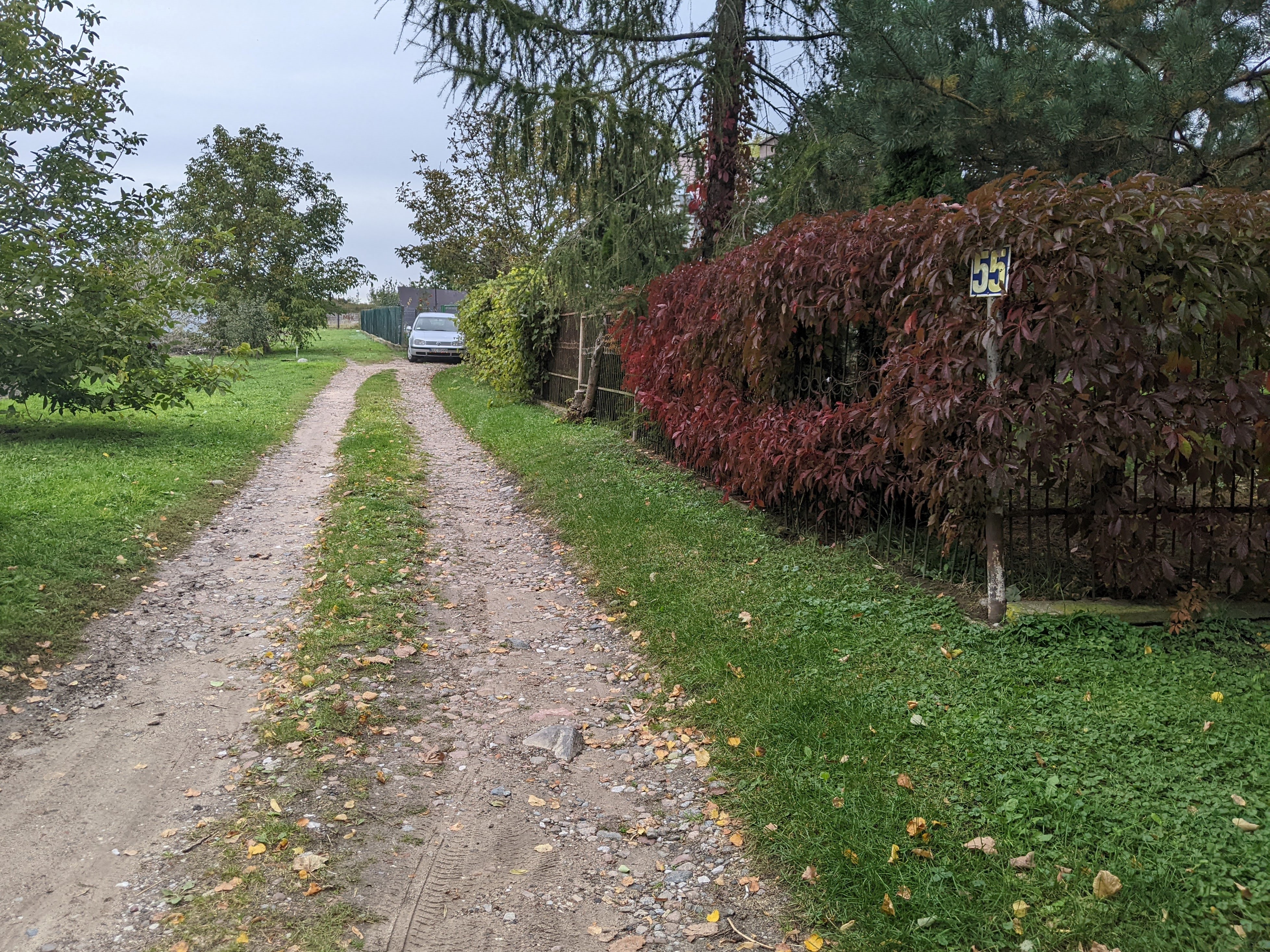 The first challenge was finding the cemetery. Even though I have been there several times and I had checked the location on Google Maps, I passed it the first time. I recognized the houses along the road from Google street view and guessed that the cemetery must be mismarked on the map. I backtracked to #55 Łukasińskiego Street and spied the cemetery gate at the end of a narrow gravel and grass-covered driveway. I parked on the shoulder of the road, careful not to block the driveway which leads to a farmhouse on the right-hand side. A plowed agricultural field is on the left side of the drive. The homeowners and their ducks and chickens watched me as I walked by their yard to the cemetery gate.