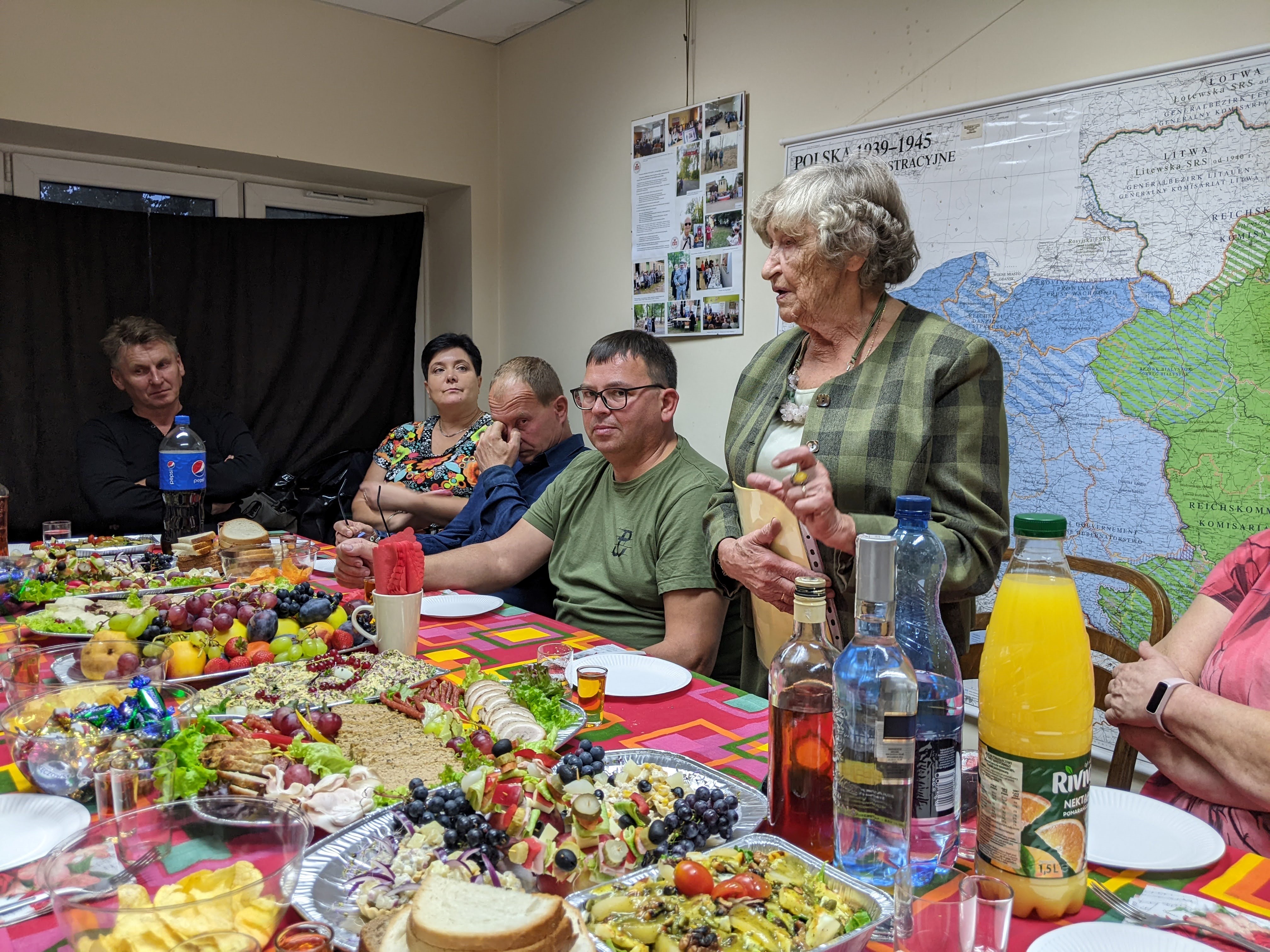 I ended the evening with the Association of Żychlin History Enthusiasts. My intention was to record some of the members’ recollections about wartime in Żychin. Serendipitously, my visit coincided with that of a guest of honor, Marianna Rybicka, who was a child during WWII; her memoir was published by the TMHŻ. She arrived from Płock with her daughter Iwona who brought a table full of food. Here, Marianna is telling her story: