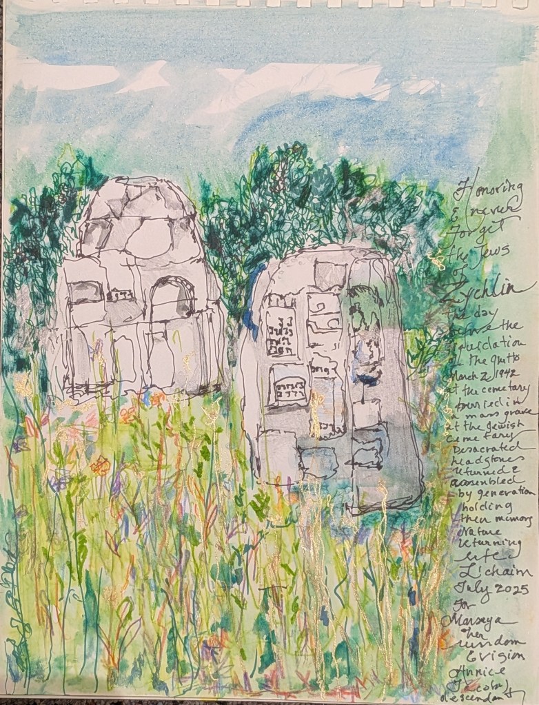 Her text reads, “Honoring and never forget the Jews of Zychlin the day before the liquidation of the ghetto March 2, 1942 at the cemetery buried in a mass grave at the Jewish cemetery Desecrated headstones returned and assembled by generation holding their memory Nature returing life L’chaim July 2025 For Marysia her […dom] and vision Annice Jacoby descendant”