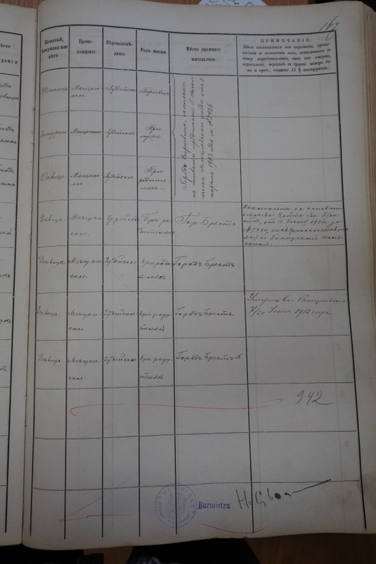 It is not clear from this document when the family moved to Brześć Kujawski. A note by the first three names states they were registered as residents of Skierniewice; it’s dated April 3, 1903. So where were they living at the end of the 19th and beginning of the 20th centuries? In Skierniewice, Sobota, or Brześć Kujawski? Or could they have been in Włocławek already? Hil Majer is on the Włocławek voters list in 1907, and his obituary says he died there in 1929. Aunt Pat lists Hinda’s place of death as Włocławek in 1933. All these places are within one hundred miles of each other, more or less in a line headed northwest from Warsaw.
