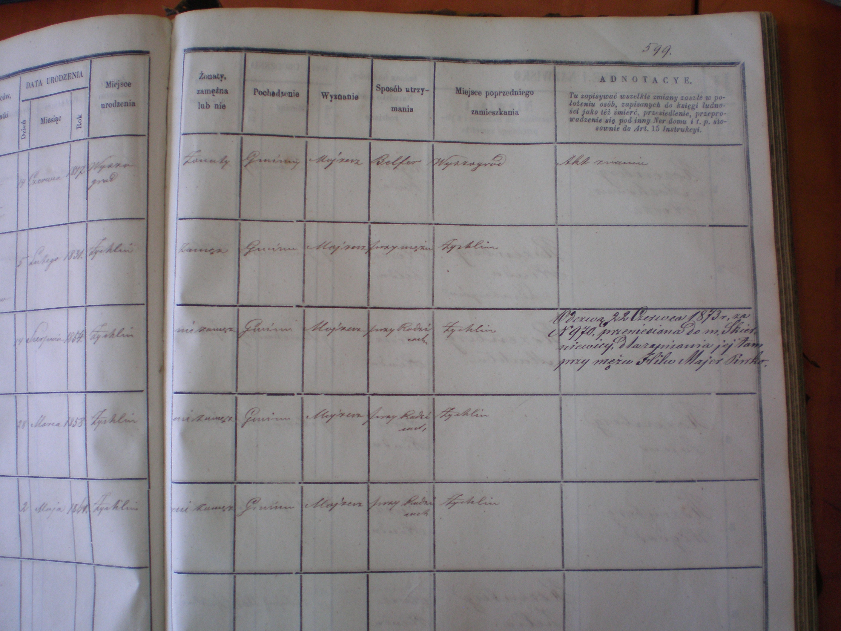Hinda’s name is crossed out and a note is added on June 22, 1873 that she moved to Skierniwice to live with her husband Hil Majer Piwko. Hinda’s sister Tema eventually married Hil Majer’s younger brother Jankel Wolf, from whom the Zurich Piwkos descended.