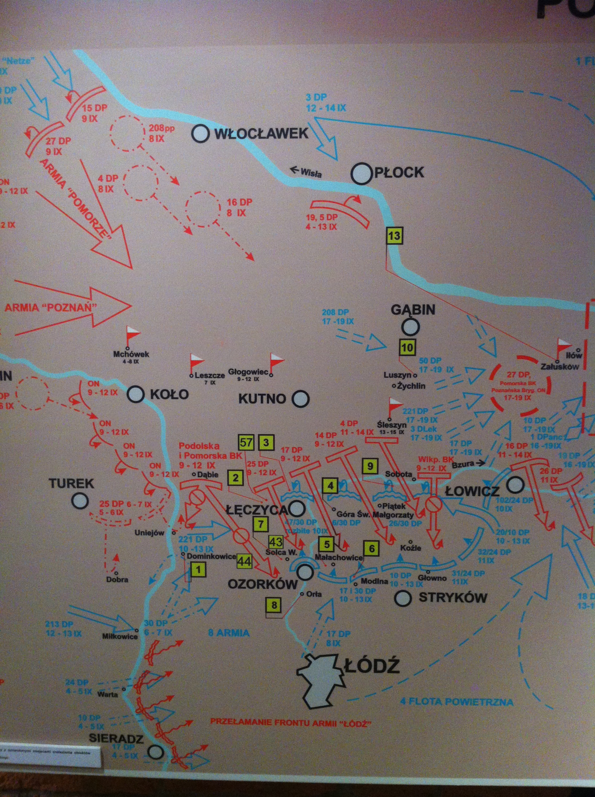 While going through photos, I came across this map from the Muzeum Uzbrojenia in Poznan showing the movement of the Polish army (shown in red) through central Poland when the Nazis invaded in September 1939 :